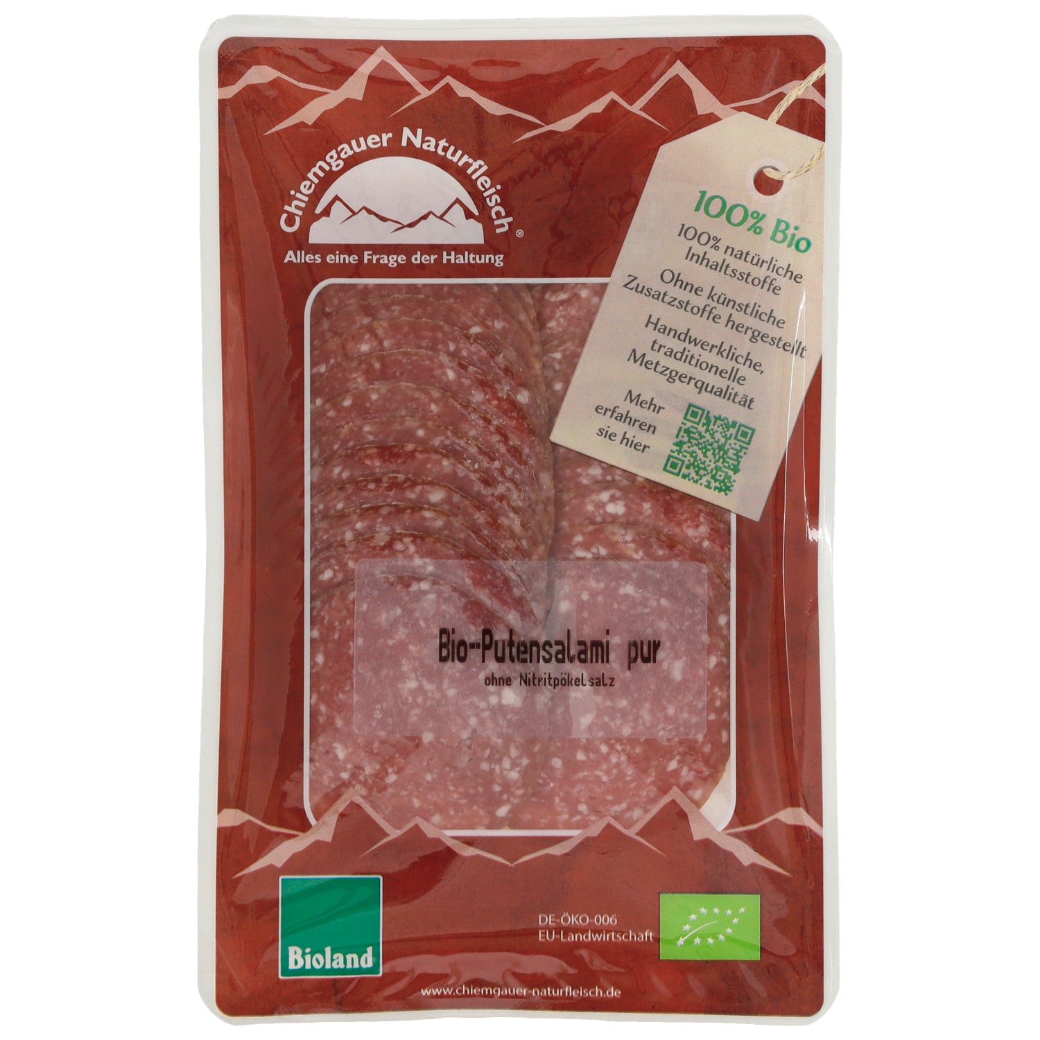 Zutaten: Putenfleisch* (98%), Palmfett*, Meersalz, Rohrohrzucker*, Pfeffer weiß*, Knoblauch, Buchenholzrauch, Reifekulturen. 100g Salami wurden hergestellt aus 130g Putenfleisch.