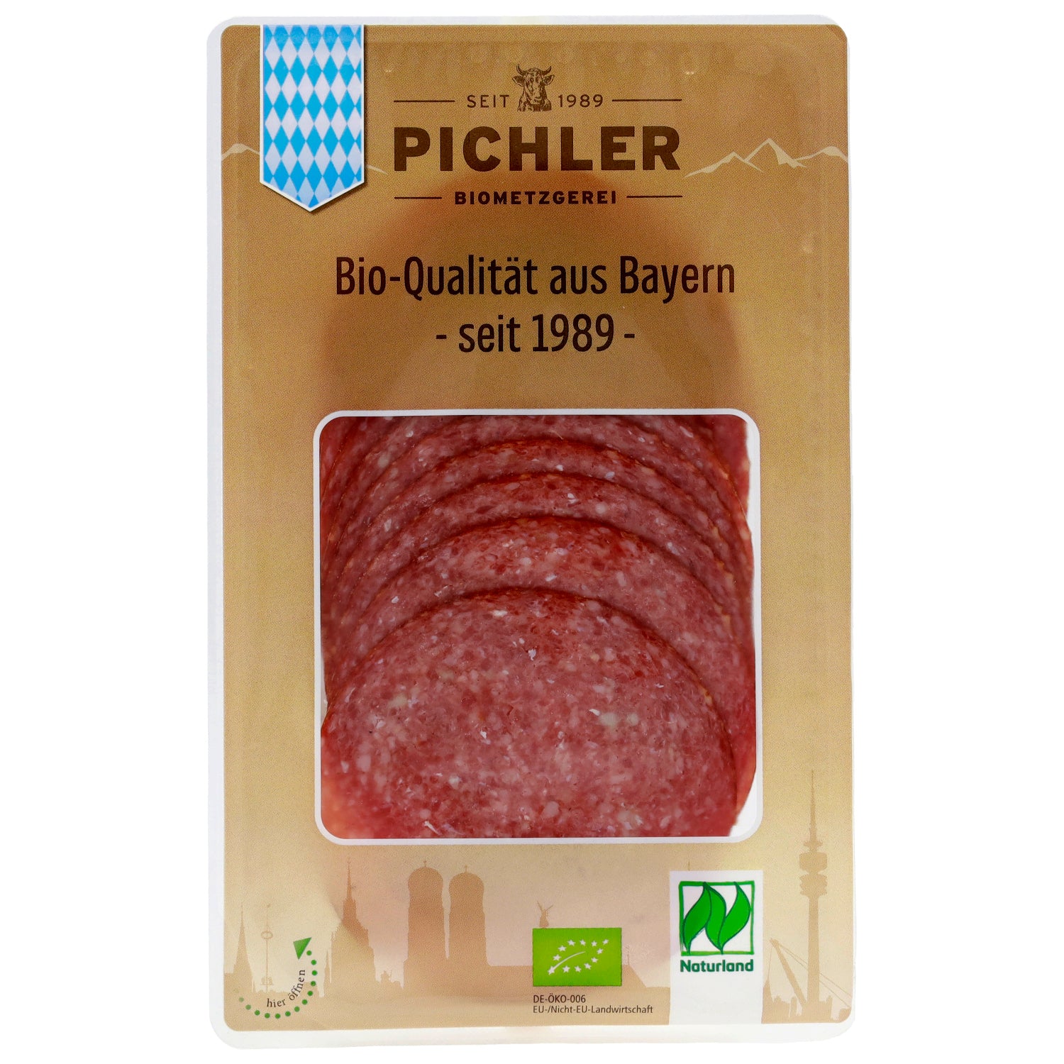 Zutaten: Schweinefleisch*, Rindfleisch*, Speck*, Meersalz, Gewürze*, Dextrose*, Tomatenpulver*, Konservierungsstoff: Natriumnitrit, Rauch.